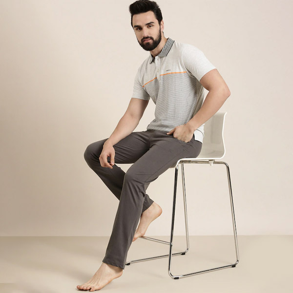 Men Off White & Grey Striped Night suit
