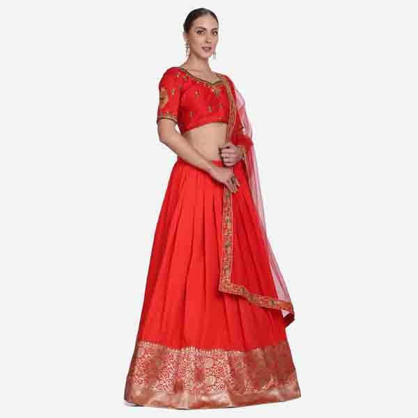 lehenga fabric: taffeta silk || inner fabric: crepe || choli fabric: taffeta silk || dupatta fabric: net || lehenga length: 42 inch || choli size: 0.80 mtr || dupatta length: 2.2 mtr || lehenga work: lace work|| choli work: embroidery work || dupatta work: embroidery lace work.